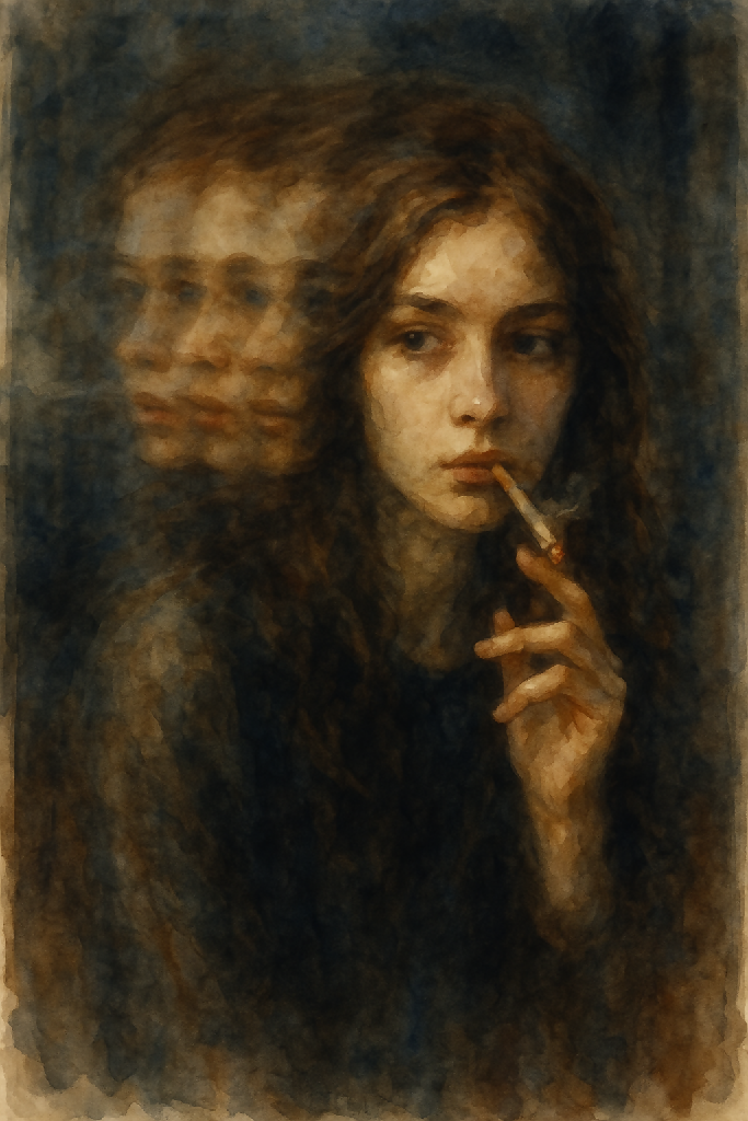 "A young woman emerges through layers of motion—her cigarette glowing faintly as faces blur and shift in long exposure. Shadows and light collide in cinematic tones, wrapping the scene in mystery, as if her very identity drifts like smoke between reality and illusion."