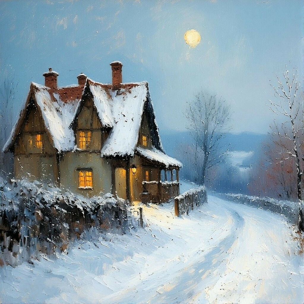 This Ai Christmas painting depicts a serene winter night, where a charming, snow-covered cottage stands as a beacon of warmth amidst a tranquil, frosty landscape. Golden light spills from the windows and doorway, creating a cozy contrast against the cool blue hues of the evening sky and the pristine white blanket of snow. A luminous full moon hangs high above, casting a soft glow over the winding snowy path and the bare, delicate branches of winter trees.