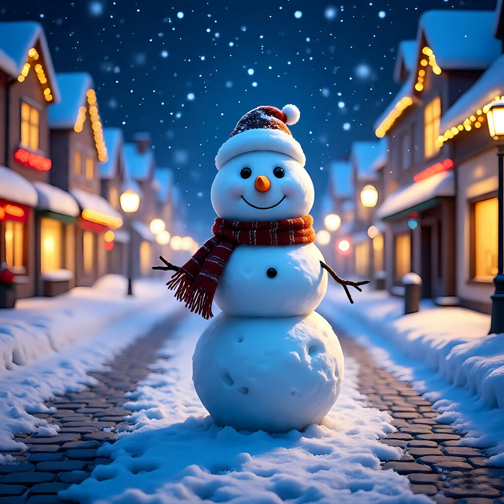 This delightful artwork brings to life the magic of a festive winter night in a charming village. A cheerful snowman, dressed in a striped scarf and Santa hat, stands proudly on the cobblestone street as snowflakes gently fall. Warmly lit houses adorned with Christmas lights and glowing street lamps create a cozy atmosphere of joy and celebration. The scene tells a timeless story of holiday traditions, community spirit, and the wonder of winter nights, making it a perfect piece to capture the essence of seasonal cheer.
