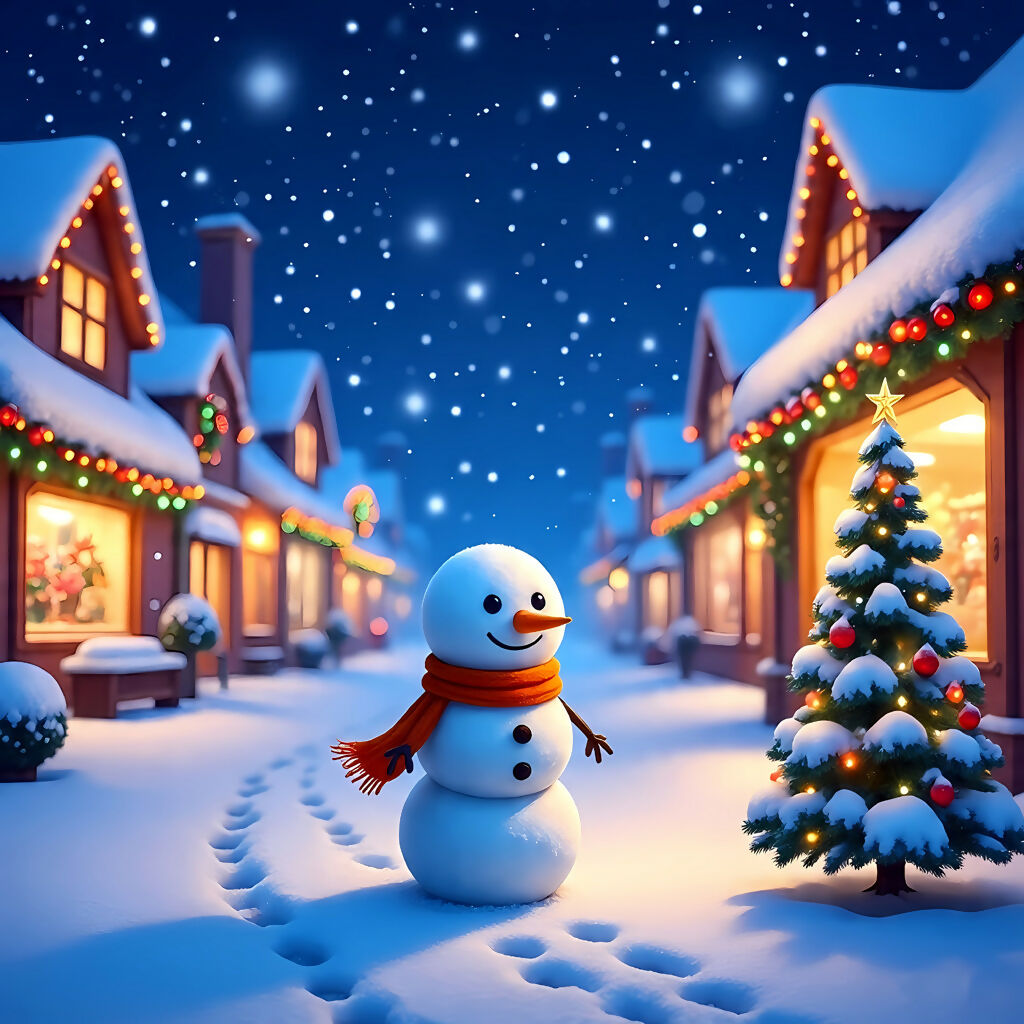 Snowman Village Celebration is a joyful AI-generated artwork that captures the essence of holiday magic in a snowy village. At the heart of the scene stands a cheerful snowman with a bright red scarf, surrounded by fresh snow and footprints that tell of playful gatherings. A glowing Christmas tree adorned with ornaments and a golden star adds festive charm, while cozy houses with warmly lit windows and holiday decorations complete the enchanting atmosphere. This piece tells a timeless story of community, warmth, and celebration—where winter nights sparkle with laughter, light, and togetherness.