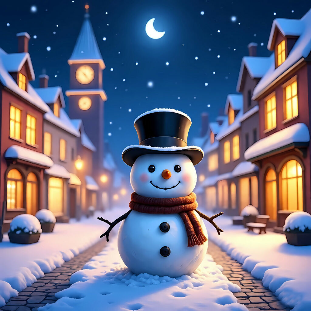 This enchanting artwork captures the heart of a snowy village night, where a cheerful snowman with a top hat and scarf stands proudly in the middle of a cobblestone street. The warmly lit houses, crescent moon, and towering clock create a timeless atmosphere of holiday cheer. Footprints in the snow whisper of children’s laughter and neighbors gathering, weaving a story of community, nostalgia, and the simple joy of winter traditions. It is a celebration of serenity and festive magic that brings warmth to any space.