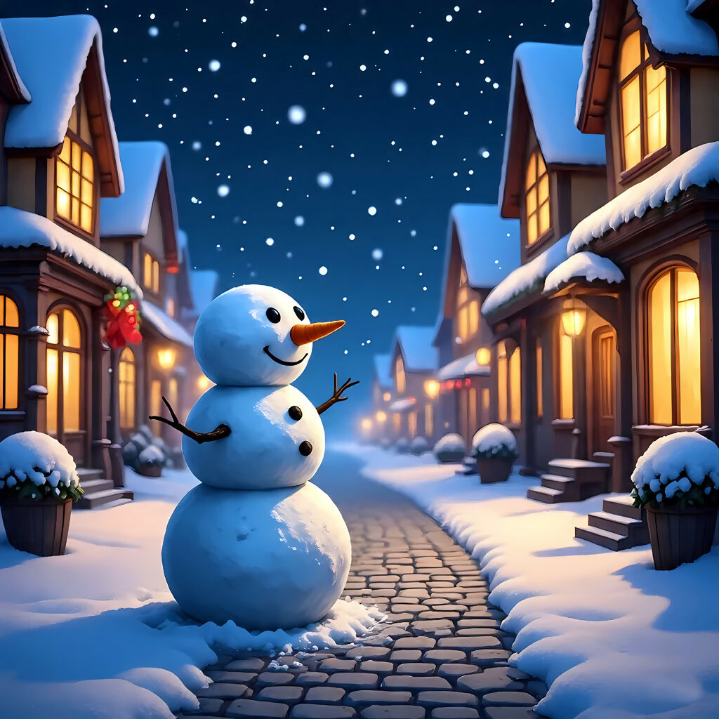 Snowman Winter Street Charm is a delightful AI-generated artwork that captures the essence of holiday warmth in a snowy village. A cheerful snowman with a carrot nose and red scarf stands proudly on a cobblestone street, surrounded by glowing houses adorned with wreaths and festive lights. Snowflakes drift gently from the night sky, adding serenity to the joyful scene. This piece tells a timeless story of celebration and community, where the simple presence of a snowman becomes a symbol of happiness, tradition, and the magic of winter nights.