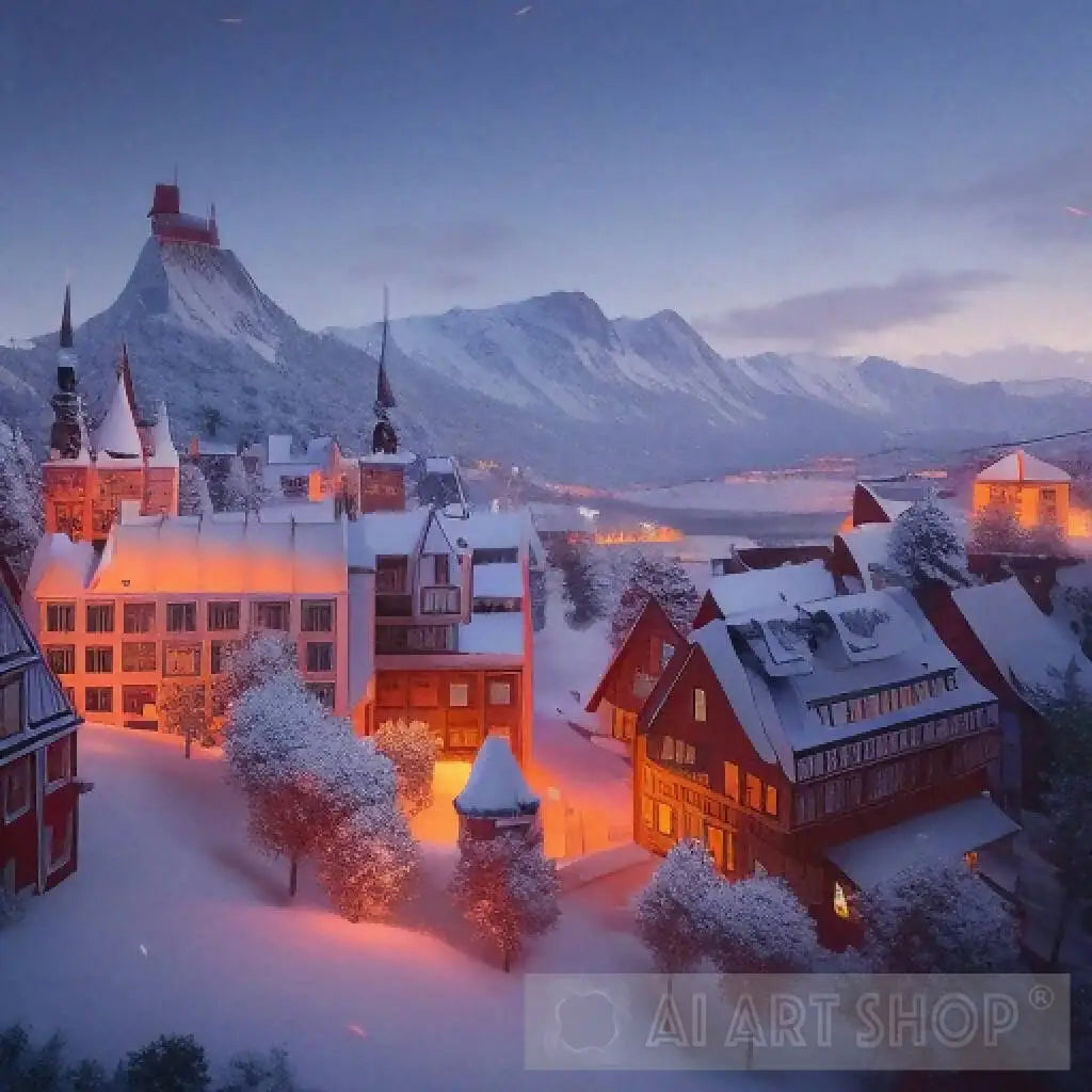 In the foreground, some houses are covered  with snow inviting the viewer to imagine themselves sitting there, taking in the serene beauty of the winter night. The trees in the area are bare, their branches covered in a light dusting of snow.