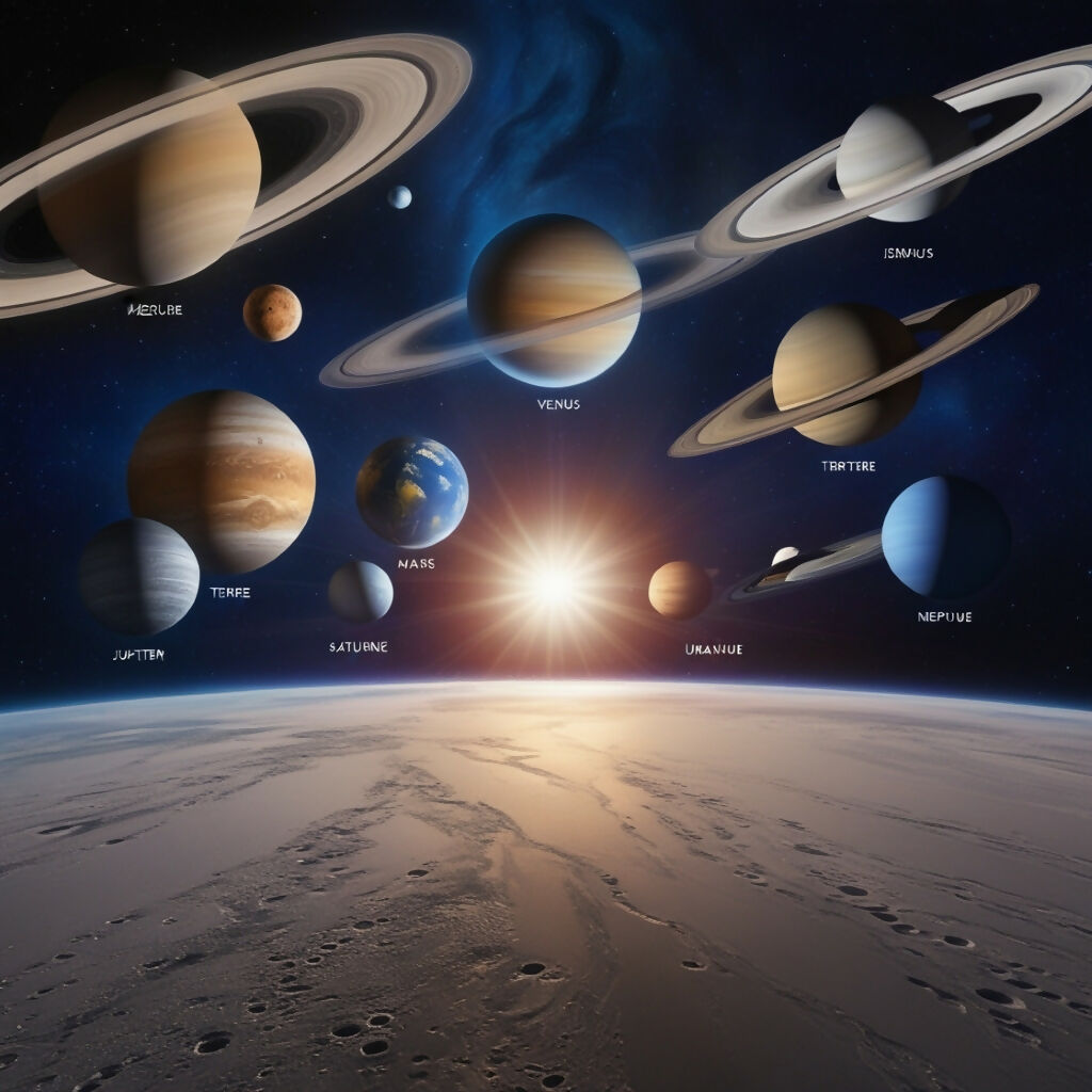 Stunning visualization of all planets in our solar system labeled with their names. Features Jupiter, Saturn, Mars, Earth, Venus, Mercury, Uranus, Neptune, and others with detailed textures, rings, and the bright sun at center against deep space.