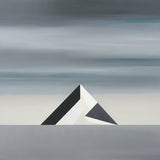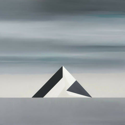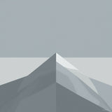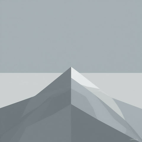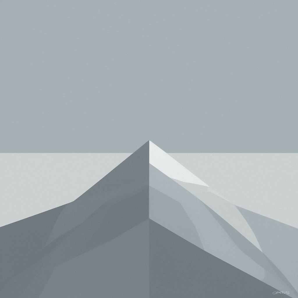 A solitary mountain peak against a vast, empty sky. Use a limited color palette of soft grays and mutedblues to emphasize simplicity and tranquility. The mountain should be a single, bold geometric shape with clean lines and subtle gradients. The sky should be expansive and unadorned, with a gentle transition from light to dark to convey depth.