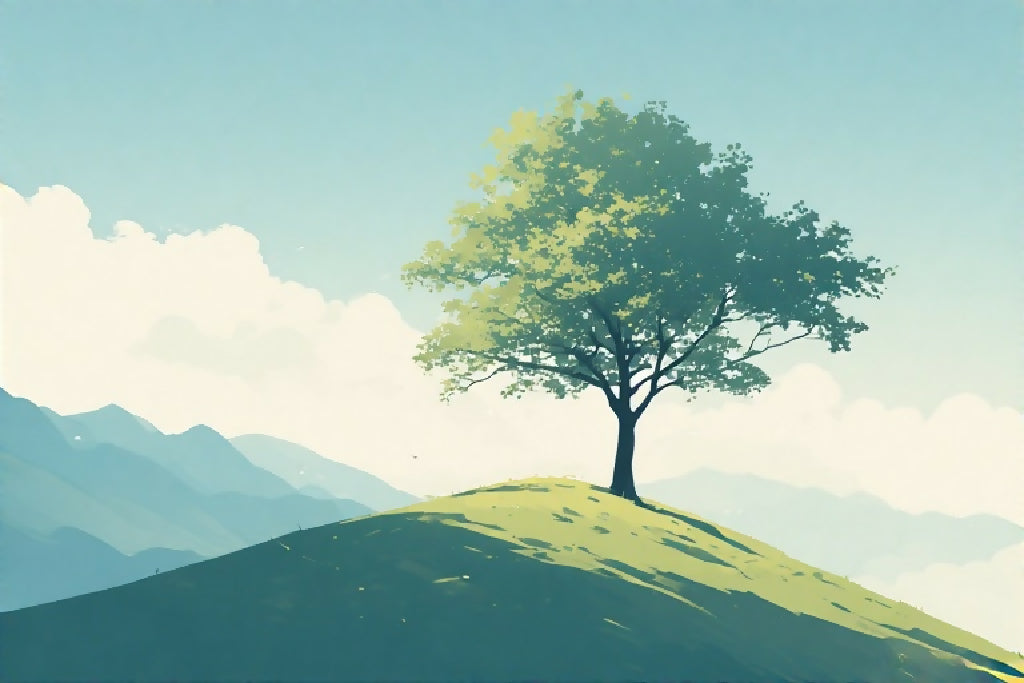 The vibrant green foliage contrasts beautifully with the soft blue tones of the horizon, creating a harmonious balance between earth and sky.