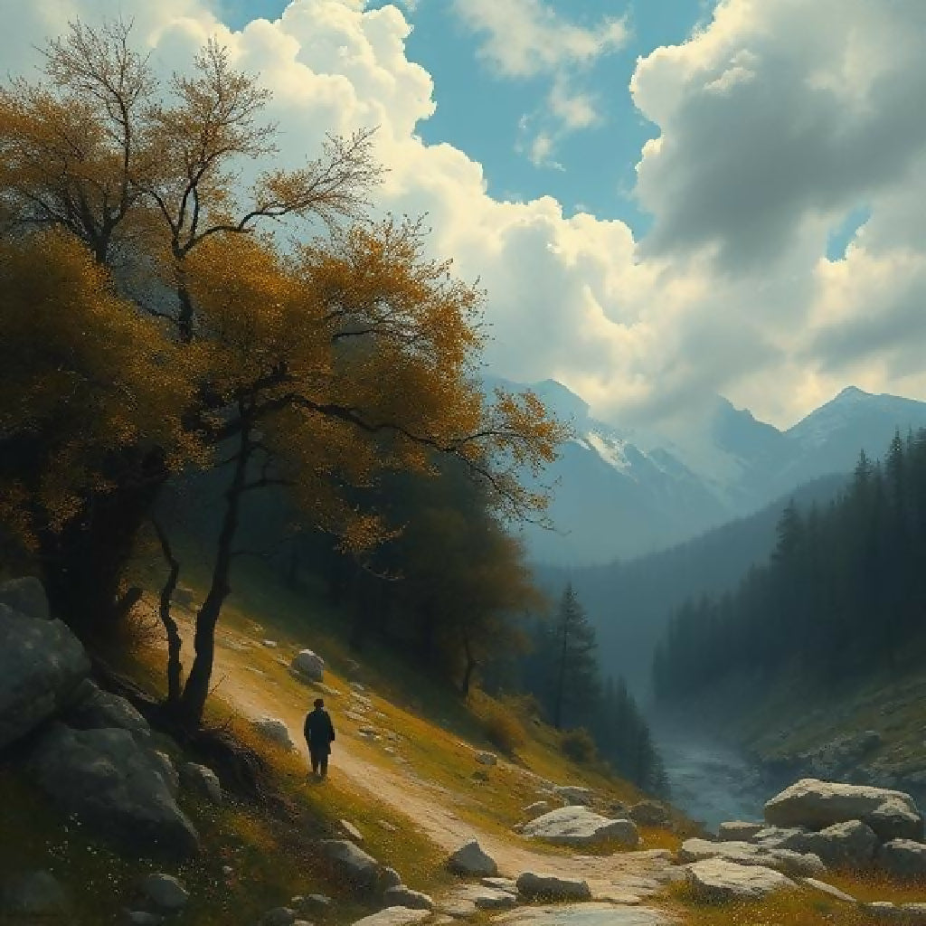 A lone figure walks a winding path through a mountainous landscape. Golden-leaved trees frame the scene, leading the eye towards snow-capped peaks in the distance. A river flows through a valley, adding depth and tranquility to the composition. The sky is a mix of blue and white, creating a sense of vastness and serenity.