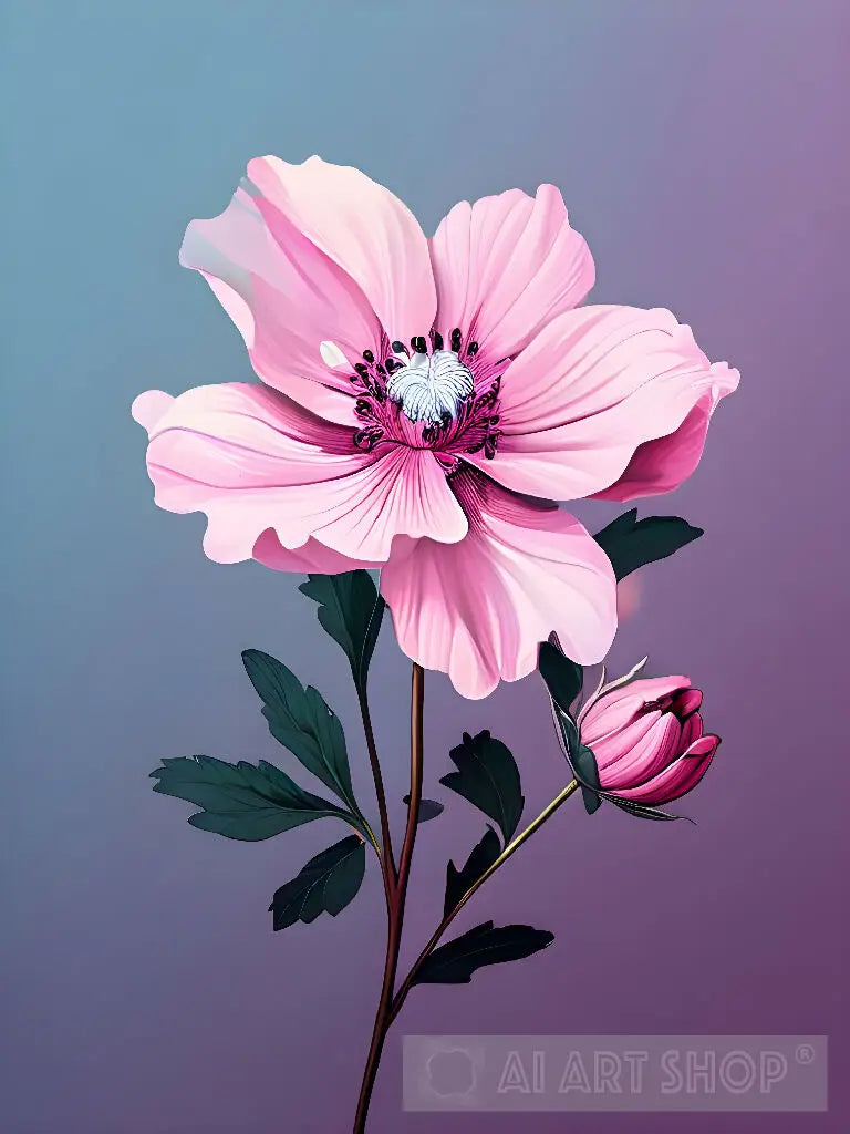 "Solo Bloom" is a captivating work of digital art featuring a single pink flower against a mesmerizing backdrop of deep purple. The flower's delicate petals and vibrant color command attention, while the rich purple hue evokes a sense of mystery and tranquility. This piece would be a stunning addition to any home or office, adding a touch of elegance and sophistication.