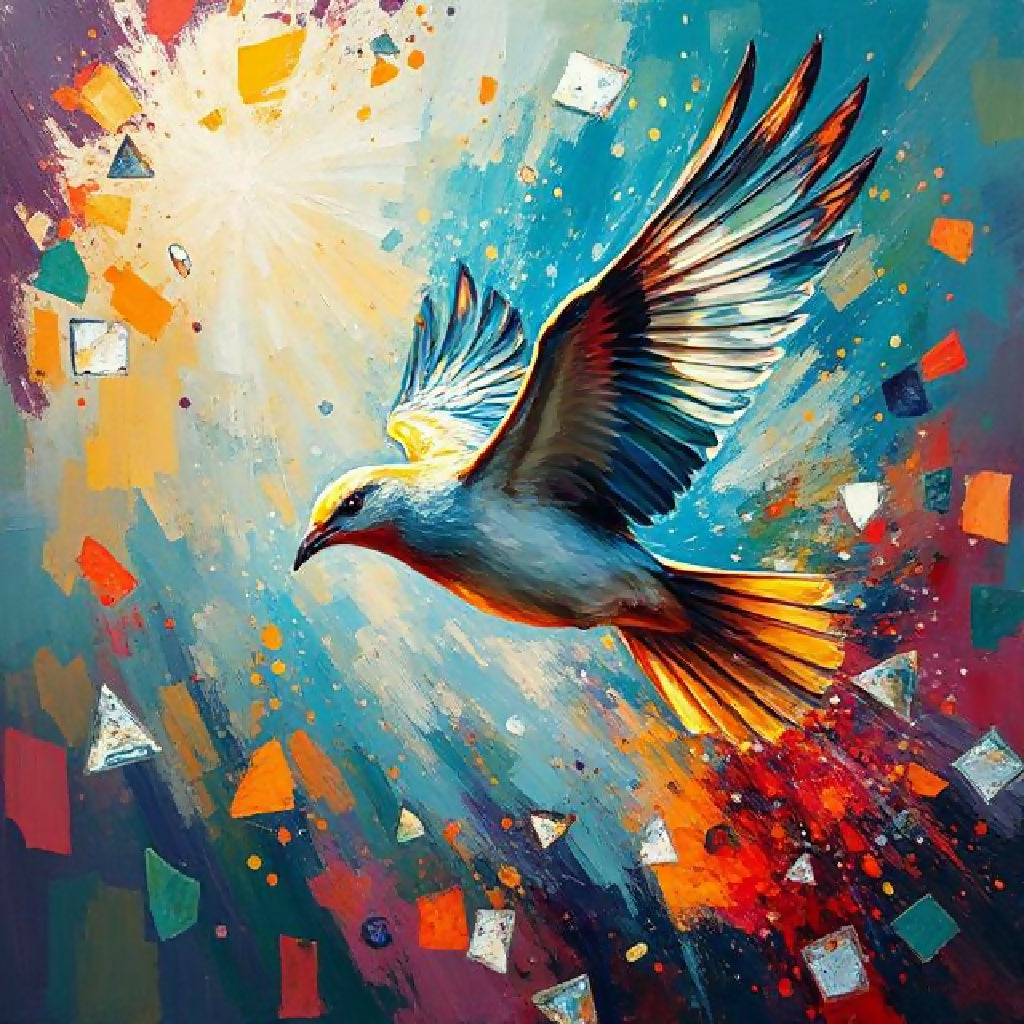 "An expressive painting of a bird mid-flight, dissolving into radiant fragments of light and glass, each piece echoing with emotions of freedom and longing."