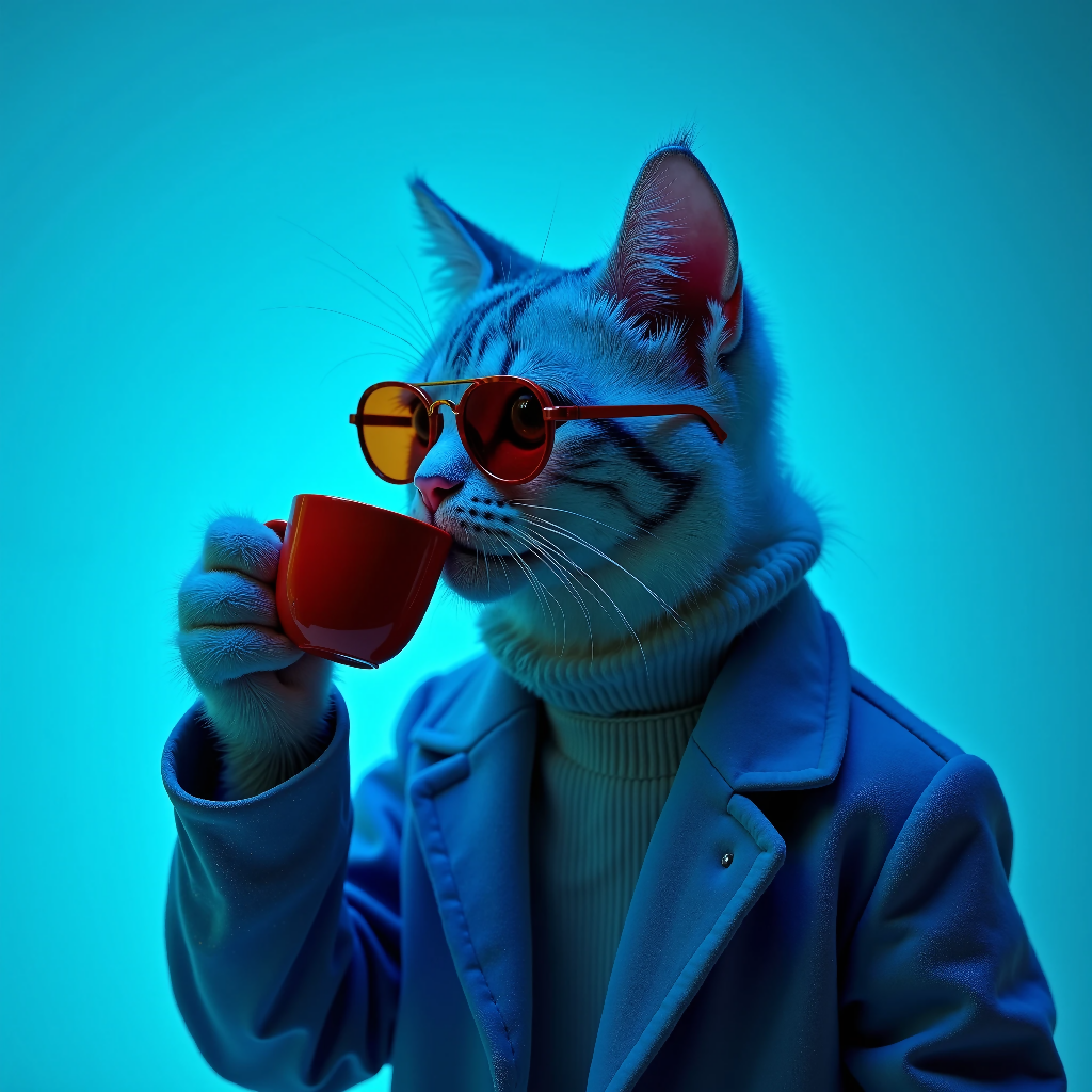 Bring a dash of charm and sophistication to your space with this captivating artwork of a trendy cat sipping coffee. Dressed in a sleek turtleneck and tailored jacket, complete with vibrant orange sunglasses, this feline exudes modern elegance against a bold blue backdrop. Perfect for cat lovers and design enthusiasts alike, this piece combines humor, style, and artistic flair, making it an eye-catching addition to any wall or décor collection. A true conversation starter!