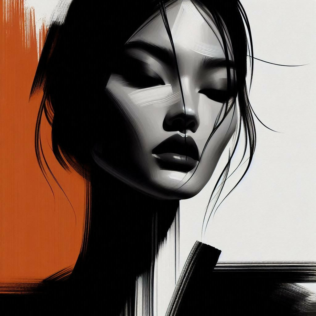 Black Orange White Minimalist Fashion Model Smooth Elegant Pose Zen-Inspired Abstract Brushstrokes Clean Lines Minimalist Composition Oil on Canvas High Contrast Sophisticated Monochromatic Palette Contemporary Female Model Fashion Forward Artistic Brushwork Keith Beauty Detailed Minimalist Brushstrokes Inspired by Herring Modern Art Style Abstract Expressionism , Refined Simplicity, ArtStation.