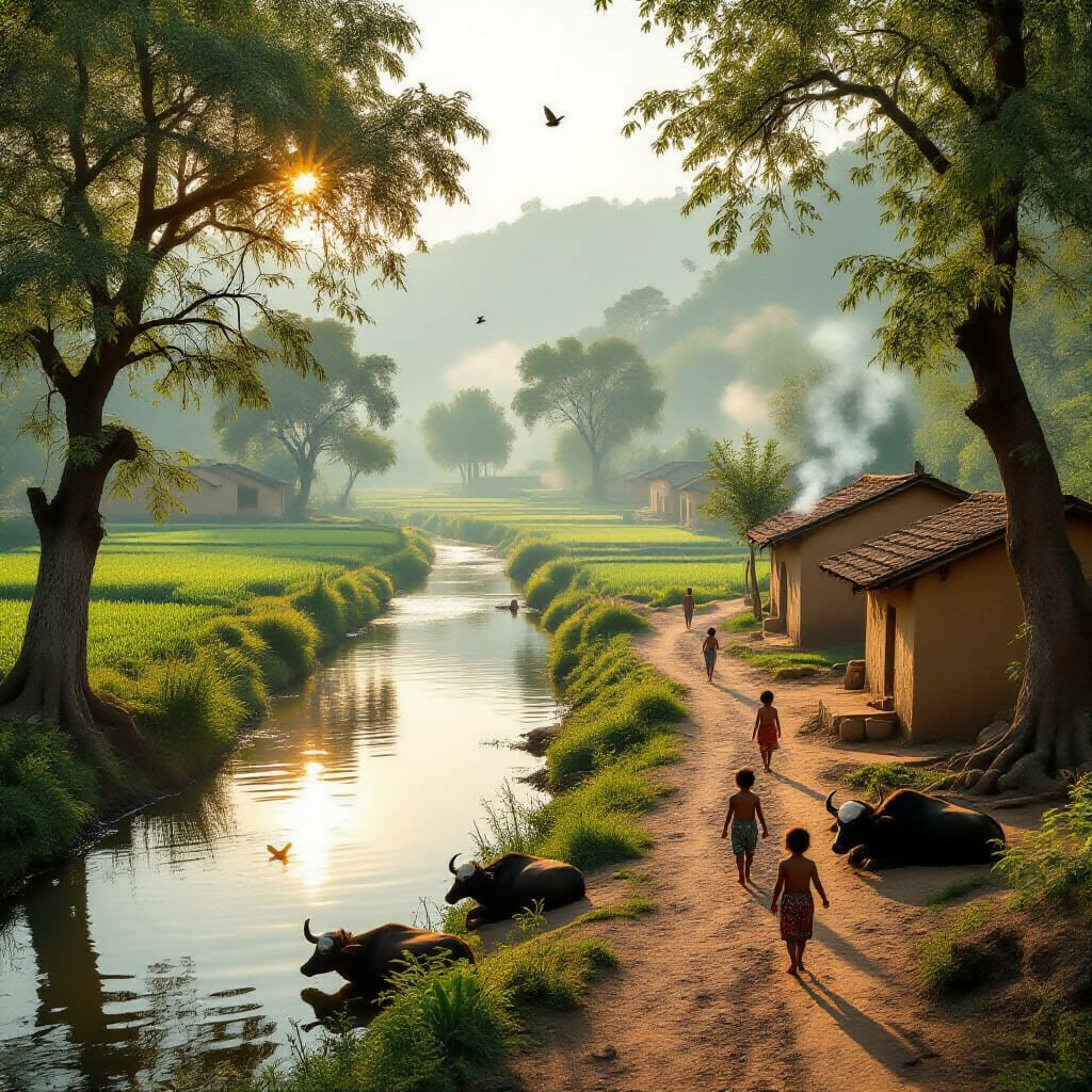 A soul-soothing countryside artwork showing a quiet Indian village at early morning, where a smooth blue river flows beside green farmlands and small clay houses glow in soft golden light. Light mist surrounds the distant hills, trees sway gently in the cool breeze, and the peaceful rural silence creates a deeply calming atmosphere. This image captures pure village serenity, nature’s beauty, and the warmth of simple life. Perfect for aesthetic wallpapers, nature lovers, and relaxing scenic visuals.