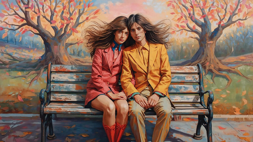 Surreal, vivid painting of two lovers in the park.