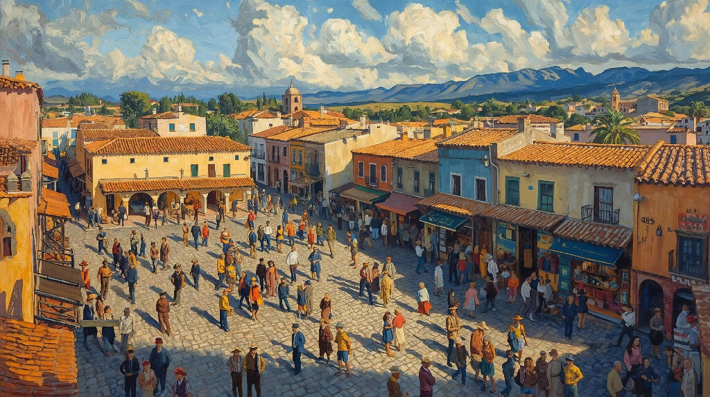 Vivid painting of people congregated in a Mexican Square with vivid colors and detailed architecture.