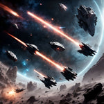A fierce outer space battle with futuristic spaceships firing lasers above a rocky alien world. A perfect choice for sci-fi fans, game designers, or digital poster art.