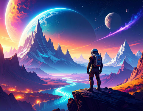 "A stunning alien planet with two moons in the sky, glowing crystal mountains, colorful nebula in the background, futuristic astronaut standing on a cliff, hyper-detailed sci-fi art"