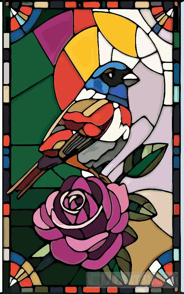 Captivating art inspired by cubism, stained glass, polygonal and pop art styles, featuring a sparrow sitting on a rose. Ready to enhance the beauty of any wall with its popping, high saturated colours.