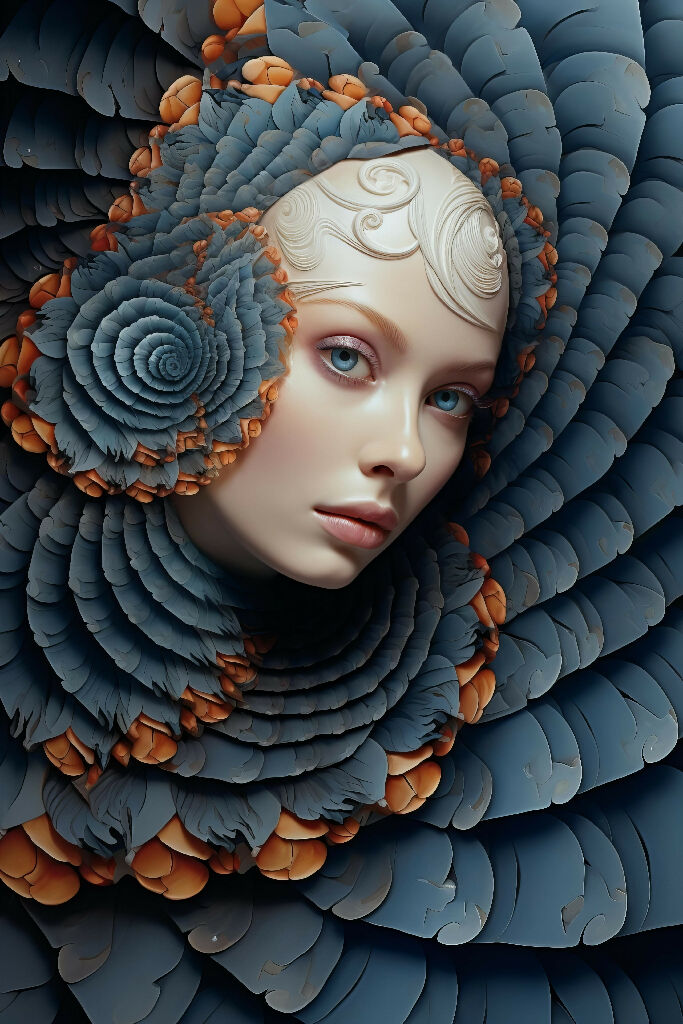 Portrait of a woman, using Midjourney and Fibonacci Sequence and original fractal art as references.