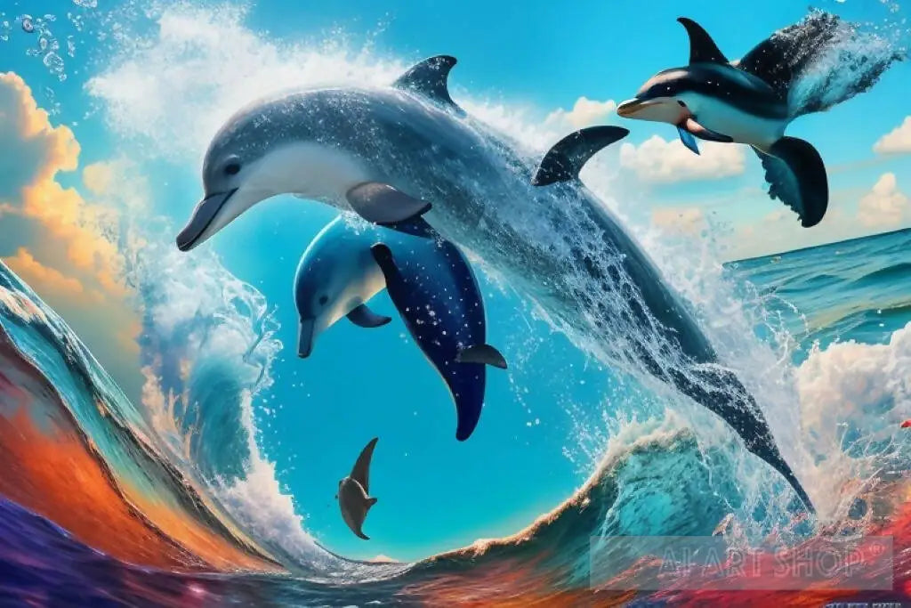In this enchanting illustration, the dolphins engage in a celestial ballet. Their sleek bodies, adorned with tripartite color patterns, slice through the water. As they breach the surface, they defy gravity, spinning and twirling like cosmic dancers. The radiant orb of light, a beacon of mystery, casts its glow upon the undulating waves. Each leap is a celebration—a symphony of joy and wonder.