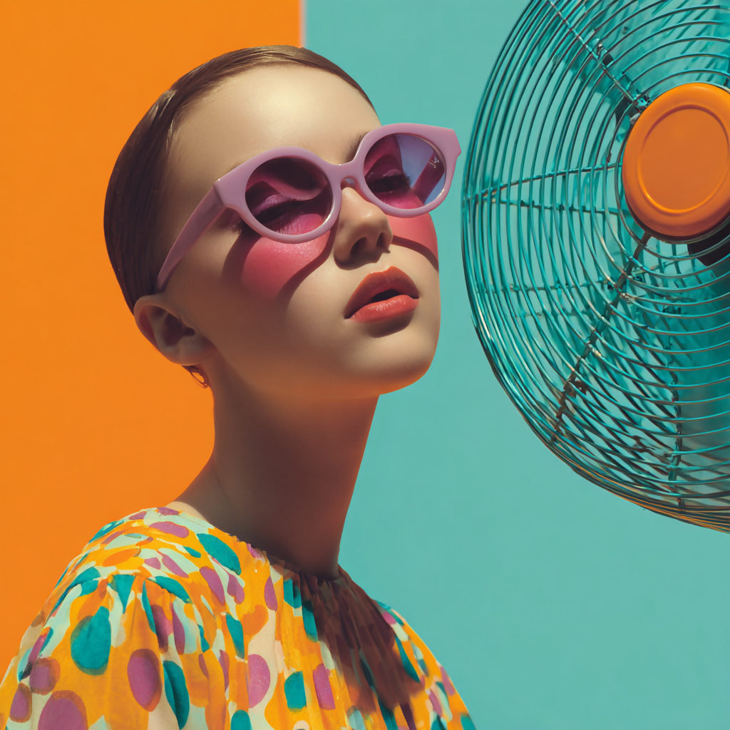 Tags: pop art fashion, polka dot shirt, electric fan, split-color backdrop, retro aesthetic, vibrant composition