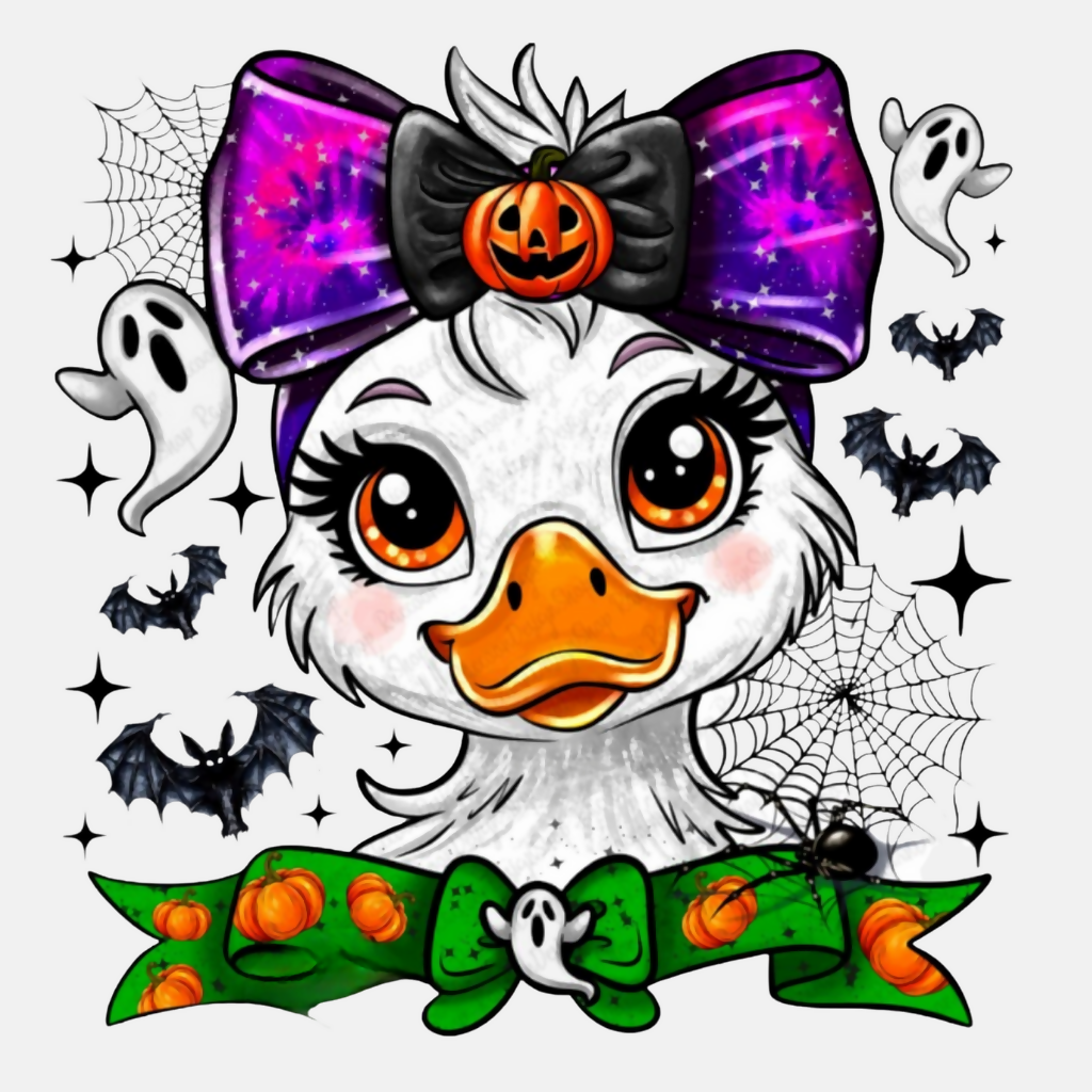Add a touch of spooky cuteness to your projects with this adorable Halloween duck digital design. This high-resolution PNG file features a cute duckling wearing a purple bow and a pumpkin headband, surrounded by playful ghosts and bats. It's the perfect instant digital download for sublimation printing, T-shirts, mugs, and other DIY crafts.