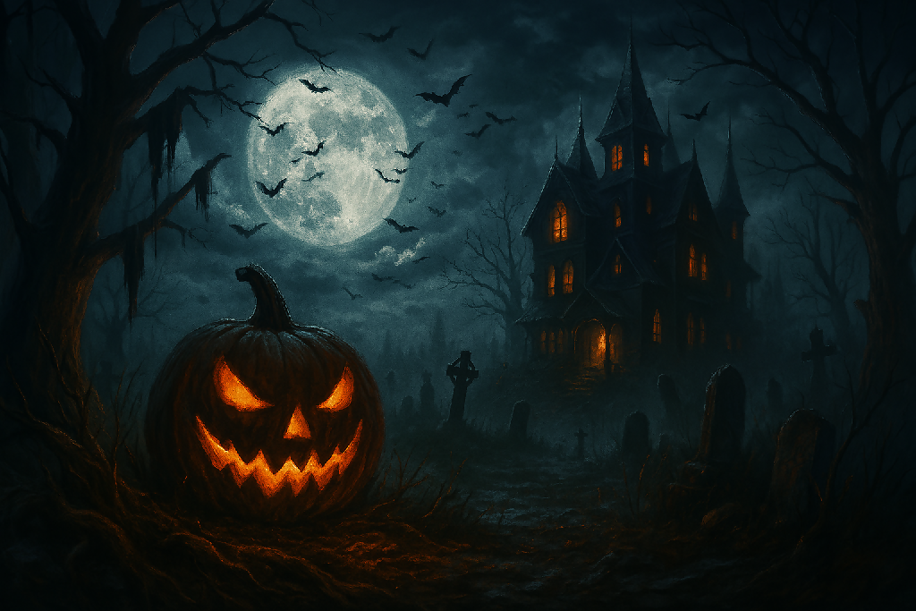 Here we have a spooky looking mansion. It looks like a dark Halloween night. The mansion is set in a cemetery with cracked headstones. There is a spooky pumpkin ringing in the Halloween spirit. Perfect for Halloween decor.