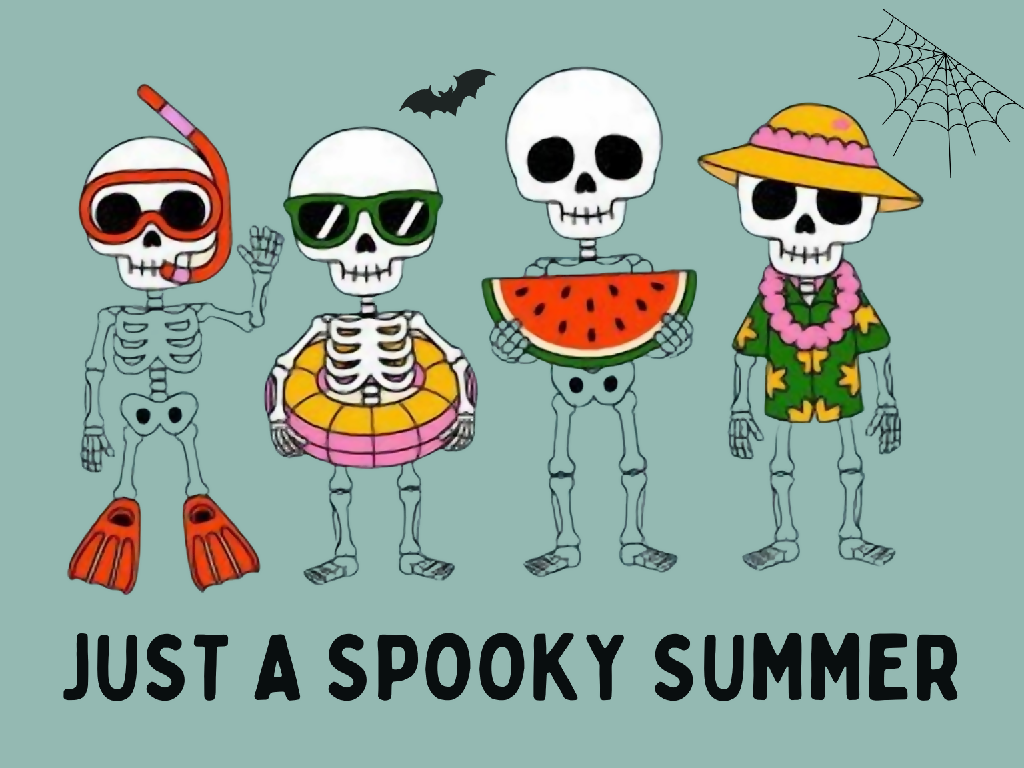 Get ready for Halloween in July with this funny "Spooky Summer" skeletons digital art print. This high-resolution PNG file features four cartoon skeletons enjoying summer vacation on a teal background. Each tropical skeleton is dressed for the beach, wearing items like a Hawaiian shirt, snorkel mask, floatie, and holding a watermelon slice.