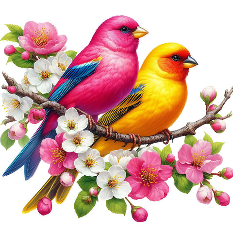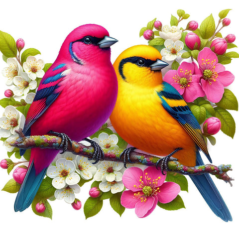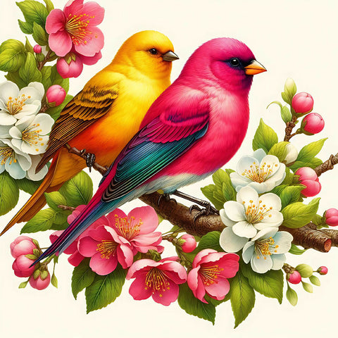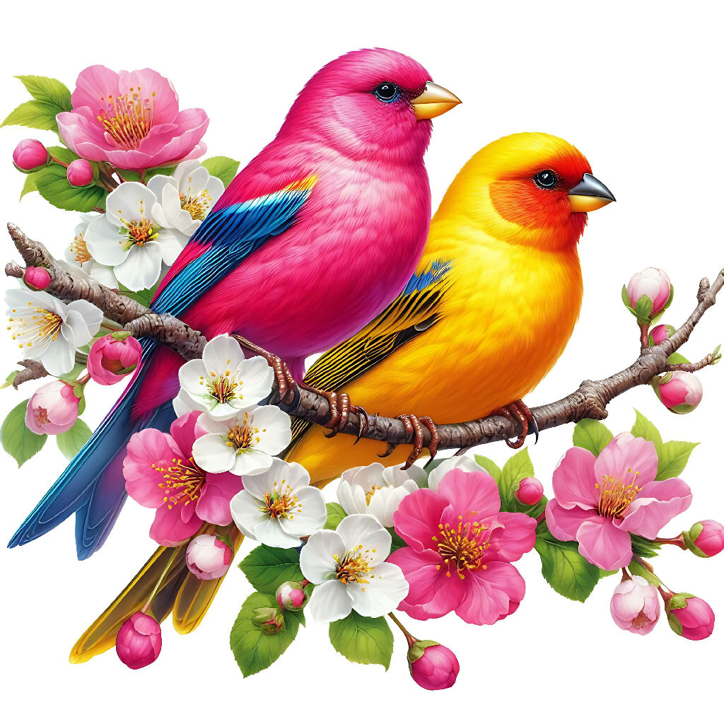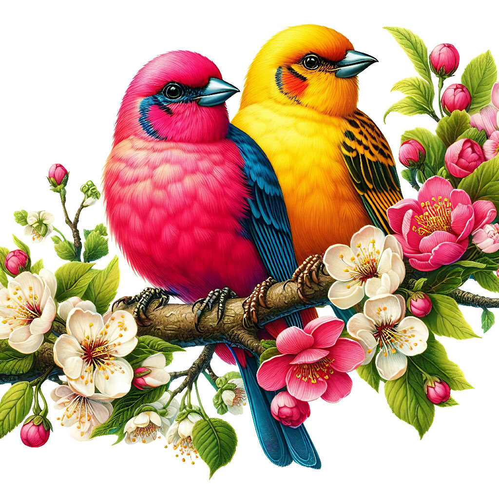 Two vibrant birds, one pink and one yellow, perch on a branch laden with white blossoms and pink flowers. The pink bird is positioned slightly to the left of center, while the yellow bird is positioned slightly to the right of center.  Both birds are in profile view, facing the viewer.  They have detailed plumage with a mix of bright colors, including red, yellow, pink, and blue.  Their beaks and feet are dark.  The birds are perched on a branch with a variety of lush, vibrant green leaves.  The background features a light blue sky and a soft, out-of-focus backdrop of more flowers and foliage. The blossoms are detailed, with varied shades of white and pink. The image is brightly lit, with a warm, optimistic atmosphere. The composition is symmetrical, with a focus on the birds and flowers, creating a harmonious and picturesque scene. The style is highly detailed and realistic, but with a touch of artistic enhancement, making the colors and details stand out vividly. The perspective is from a slightly elevated angle, showing the birds and flowers in a lush, springtime setting.