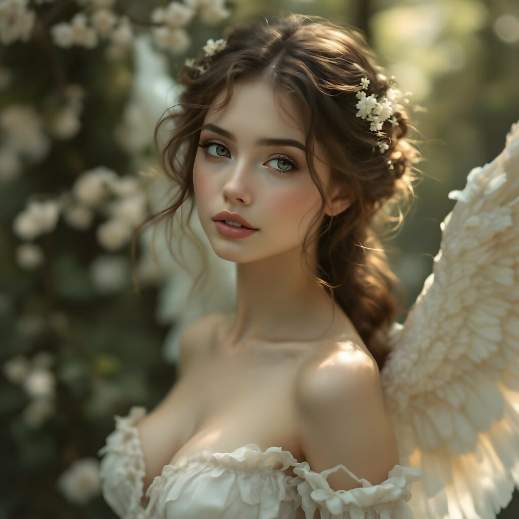 "Spring Seraph" is a breathtaking digital angel portrait that merges divine beauty with nature’s bloom. Set against a softly blurred garden backdrop, the angel's floral crown, delicate ivory wings, and luminous eyes evoke innocence, serenity, and renewal. Her calm expression and romantic pose make this piece perfect for fans of fantasy, divine femininity, and ethereal elegance.