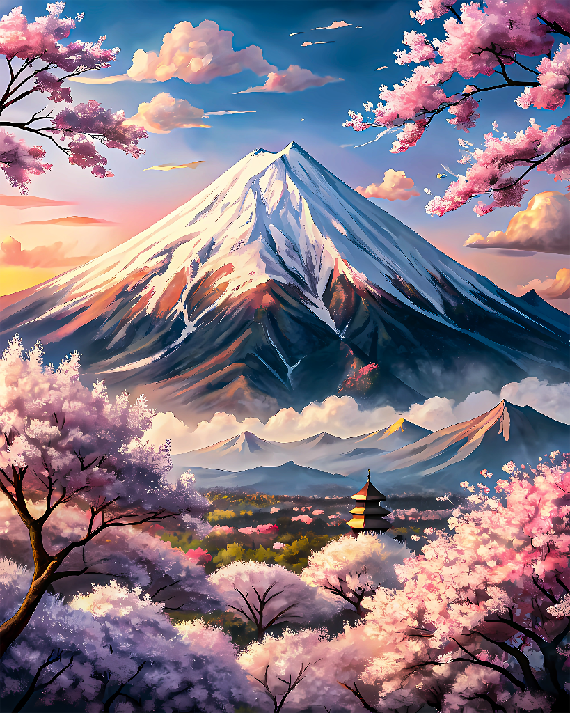 Serene Springtime at Mount Fuji with Cherry Blossoms and Pagoda
