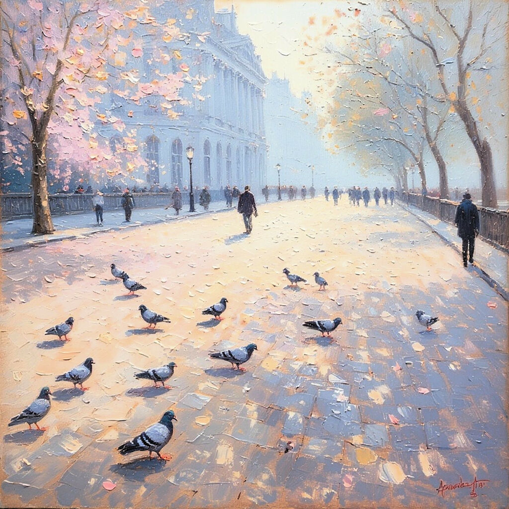 This impressionistic Ai painting captures a tranquil urban scene, bathed in soft, diffused light that suggests either early morning or late afternoon. The foreground is alive with numerous pigeons, their grey and white forms scattered across a textured, sun-dappled pavement.