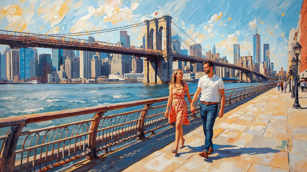 Vivid abstract painting of a couple walking along the Brooklyn Promenade on a beautiful day with the Brooklyn Bridge seen in the background.