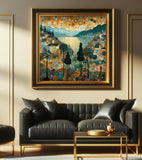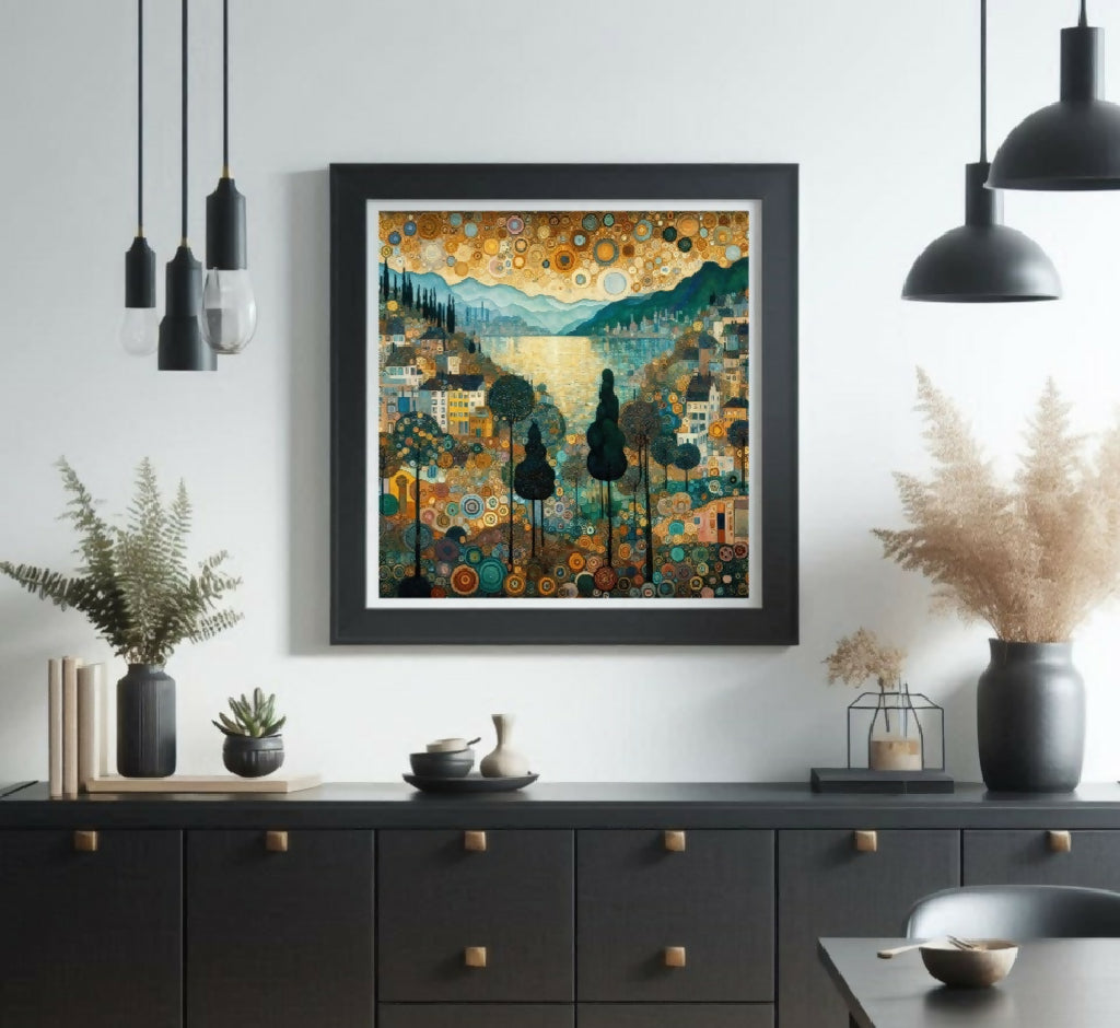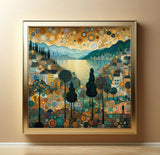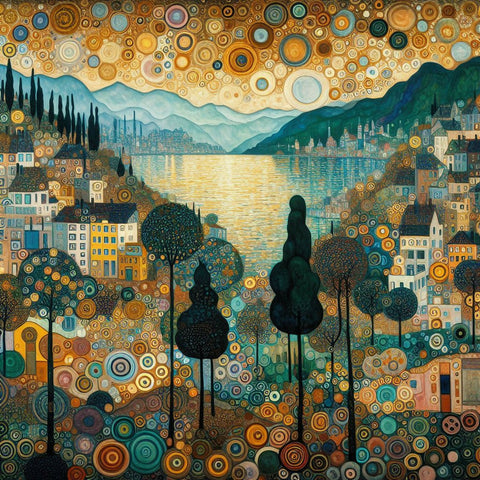 eine stilisierte Landschaft in einem impressionistischen oder pointillistischen Stil. Im Vordergrund befinden sich dunkle, schlanke Bäume mit stilisierten, runden Kronen. Darunter erstreckt sich eine Ansammlung von runden, konzentrischen Mustern in warmen Farben, die Blumen oder Büsche darstellen. Im Mittelgrund ist eine Stadt mit bunten Häusern zu sehen, die sich an einen Hang schmiegen. Dahinter erstreckt sich ein Gewässer, das von Bergen im Hintergrund begrenzt wird. Der Himmel ist mit einer Vielzahl von kreisförmigen Formen in Gelb-, Orange- und Brauntönen gefüllt, die dem Bild eine träumerische und schnell psychedelische Qualität verleihen. Die Farben sind warm und reichhaltig, mit goldenen und erdigen Tönen, die dominieren. Die gesamte Komposition ist dicht und detailreich, mit einer Vielzahl von Texturen und Mustern, die das Auge beschäftigen.