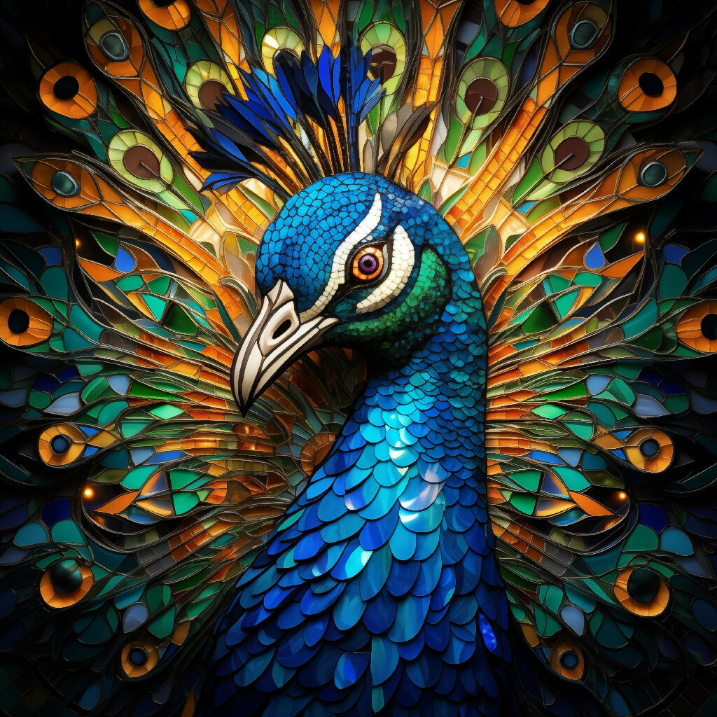 A peacock’s head and neck rendered in radiant, glasslike tiles, each feather segment a glowing panel with ornate AI-designed micro-mosaics, impossible to hand-create due to the sheer detail.