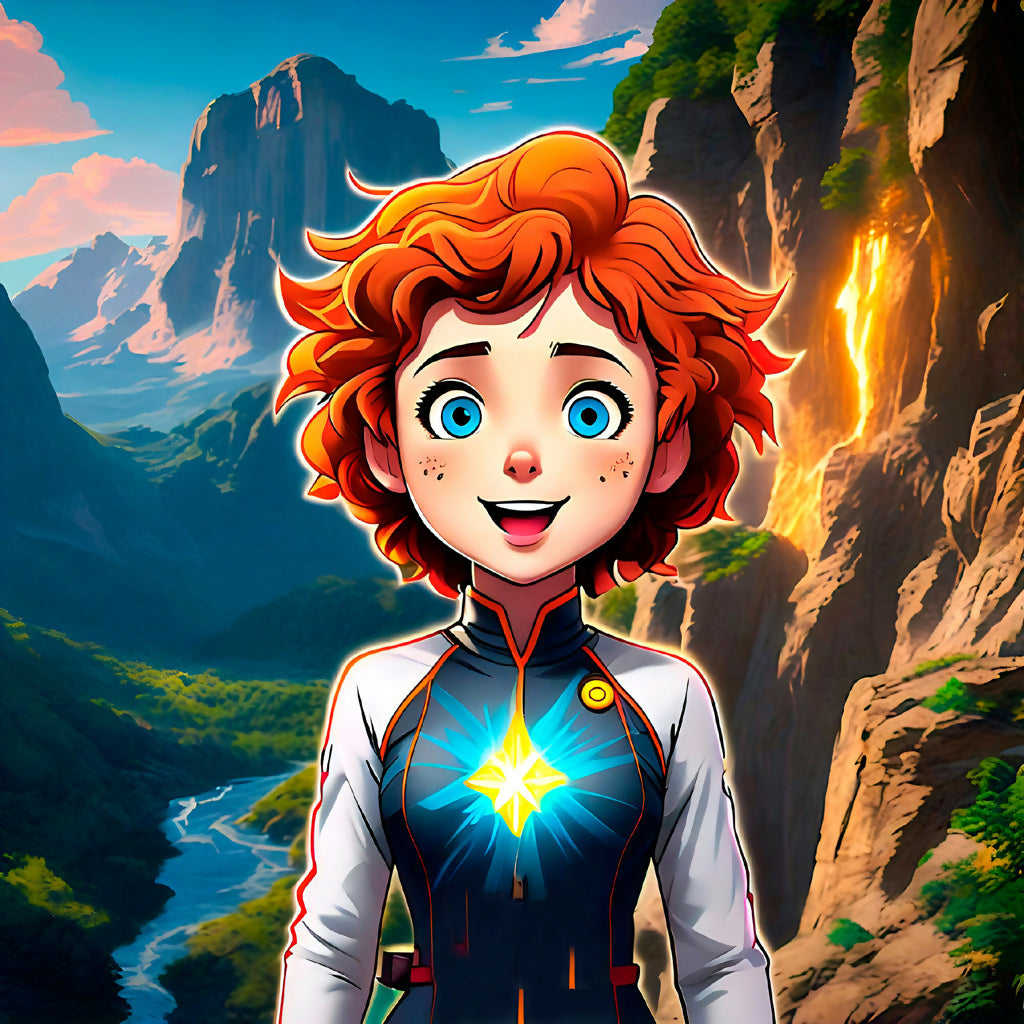 Step into a breathtaking fusion of nature and imagination with Starborn Sentinel in the Valley of Light. This AI-generated digital artwork showcases a radiant character with fiery orange curls and a glowing star emblem, standing amidst a spellbinding landscape of towering mountains, cascading waterfalls, and lush greenery. The futuristic attire contrasts beautifully with the serene natural setting, creating a visual narrative that evokes wonder, adventure, and harmony between technology and the Earth.