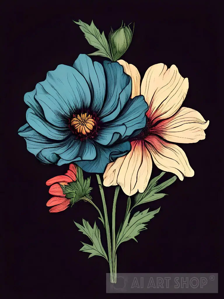 "Starlight Bloom" is a mesmerizing digital artwork featuring a bouquet of colorful flowers against a backdrop resembling a starry night sky. The deep blues and purples of the background are contrasted by the vibrant colors of the flowers, creating a visually striking and otherworldly scene.