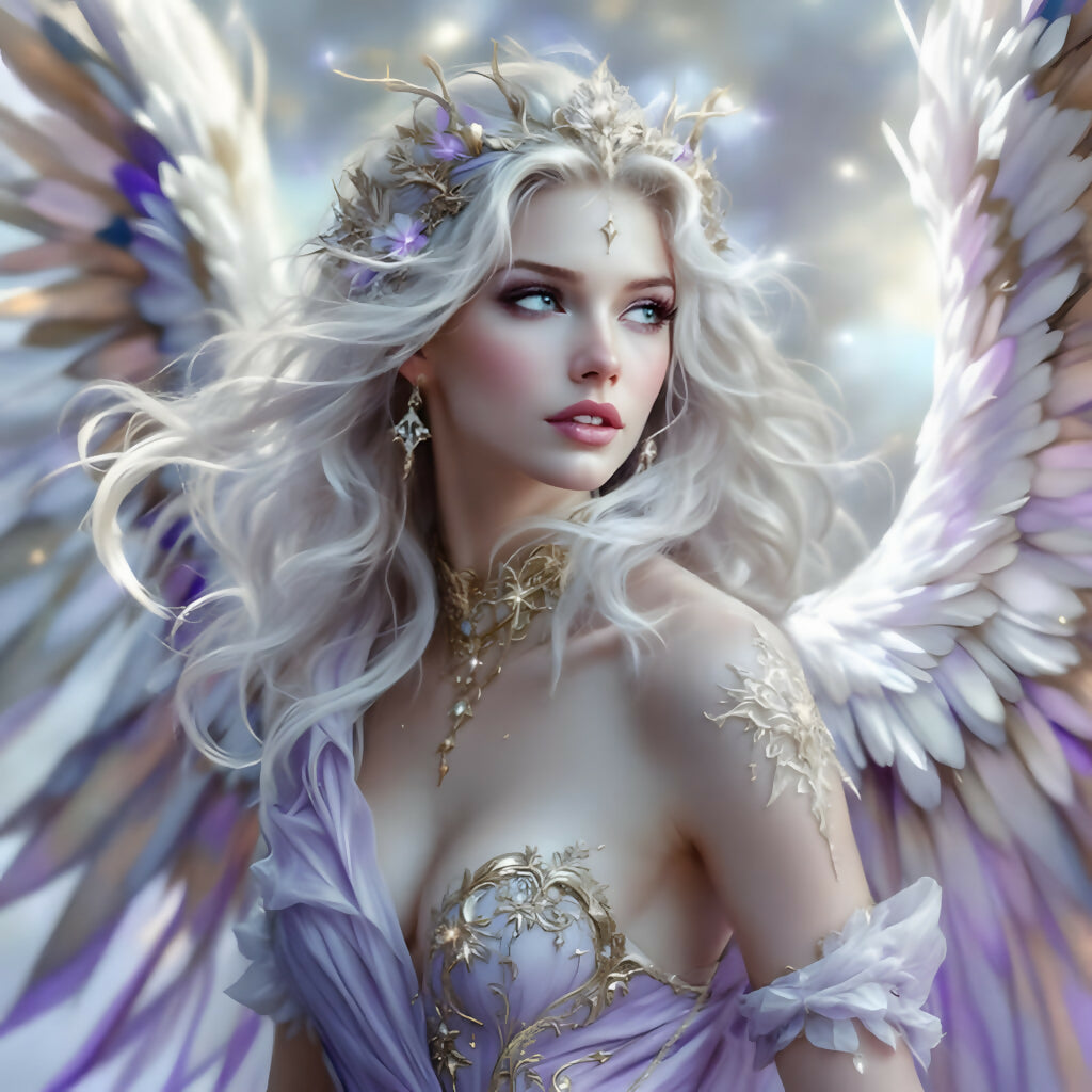 “Starlight Grace” depicts a luminous angelic maiden cloaked in pastel violet, pearl, and gold. Her flowing platinum hair, delicate crown of antlers and blossoms, and opalescent wings reflect the dawn’s light. The intricate golden embroidery on her gown and shoulder radiates divine elegance and queenly serenity.