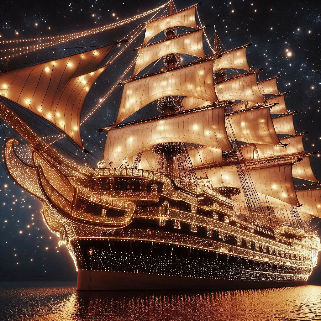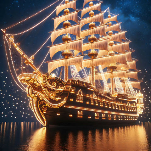 A large, ornate sailing ship, centrally positioned, is adorned with thousands of sparkling, warm-toned lights.  The ship's sails are a soft, pale white, and the hull and details are a dark, rich gold or bronze.  The lights are concentrated on the ship's rigging, sails, and along the hull, creating a magical and luminous effect.  The water surrounding the ship reflects the lights, creating shimmering patterns.  The background features a starry night sky with scattered stars and glowing celestial bodies.  Clouds are present in the upper part of the image, softly blended into the background. The lighting is soft and warm, emanating from the lights on the ship.  A sense of motion and magic is conveyed through the dynamic reflection on the water and the sparkling lights.  The perspective is slightly above the ship, viewing it in a slightly angled, yet still majestic way. The overall style is dreamy, magical, and evokes a sense of wonder and adventure.  The composition is balanced and aesthetically pleasing, showcasing the intricate details of the ship in relation to the surrounding environment.