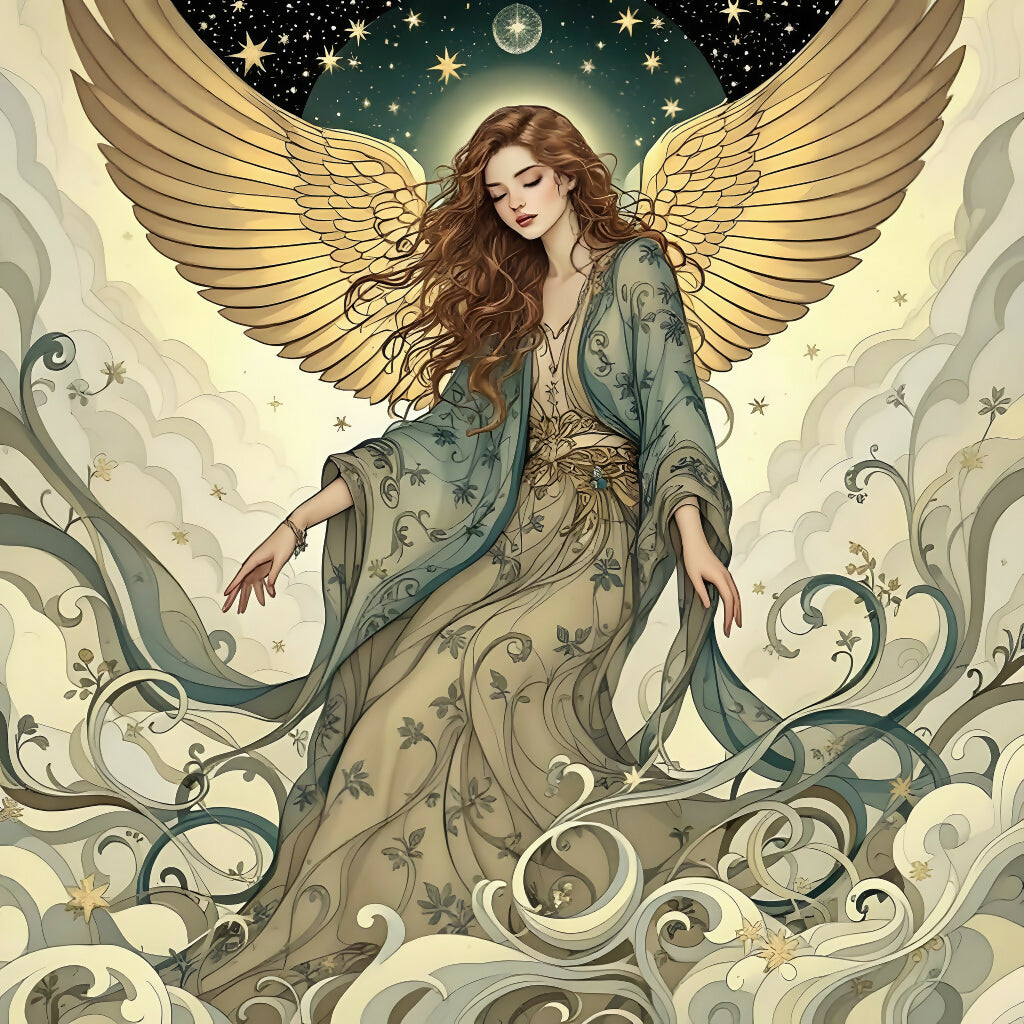 “Starlit Bloom” is an enchanting AI-generated artwork that blends celestial wonder with natural grace. A golden-winged angel draped in flowing floral robes descends through clouds, framed by starlit skies and a glowing moon. Her posture is serene, her gaze gentle — a guardian of dreams and beauty from beyond the veil.
