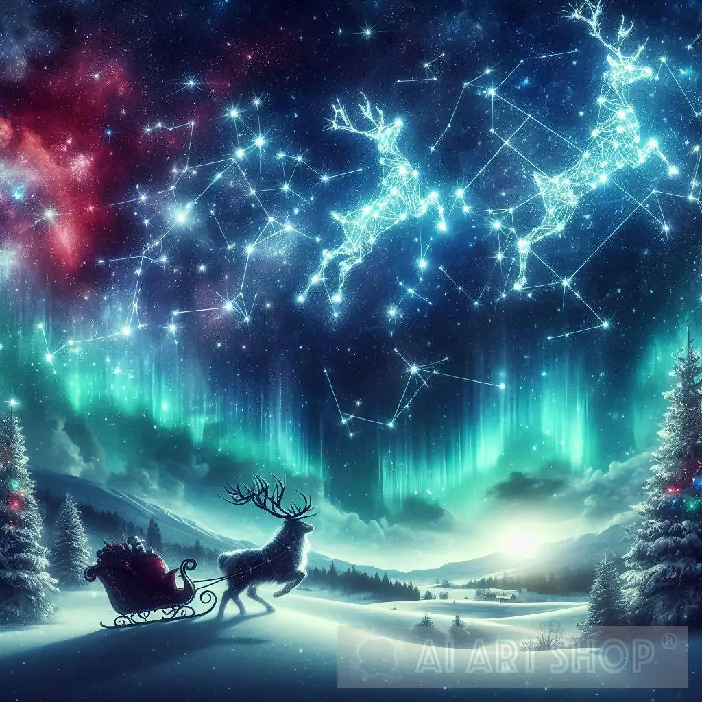Embark on a mesmerizing journey with 'Starlit Sleigh Ride: Celestial Christmas Dreamscape.' In this enchanting masterpiece, the canvas comes alive with the celestial wonders of a winter night. The expansive night sky is adorned with constellations forming festive shapes, creating a celestial tapestry that evokes the magic of the holiday season.