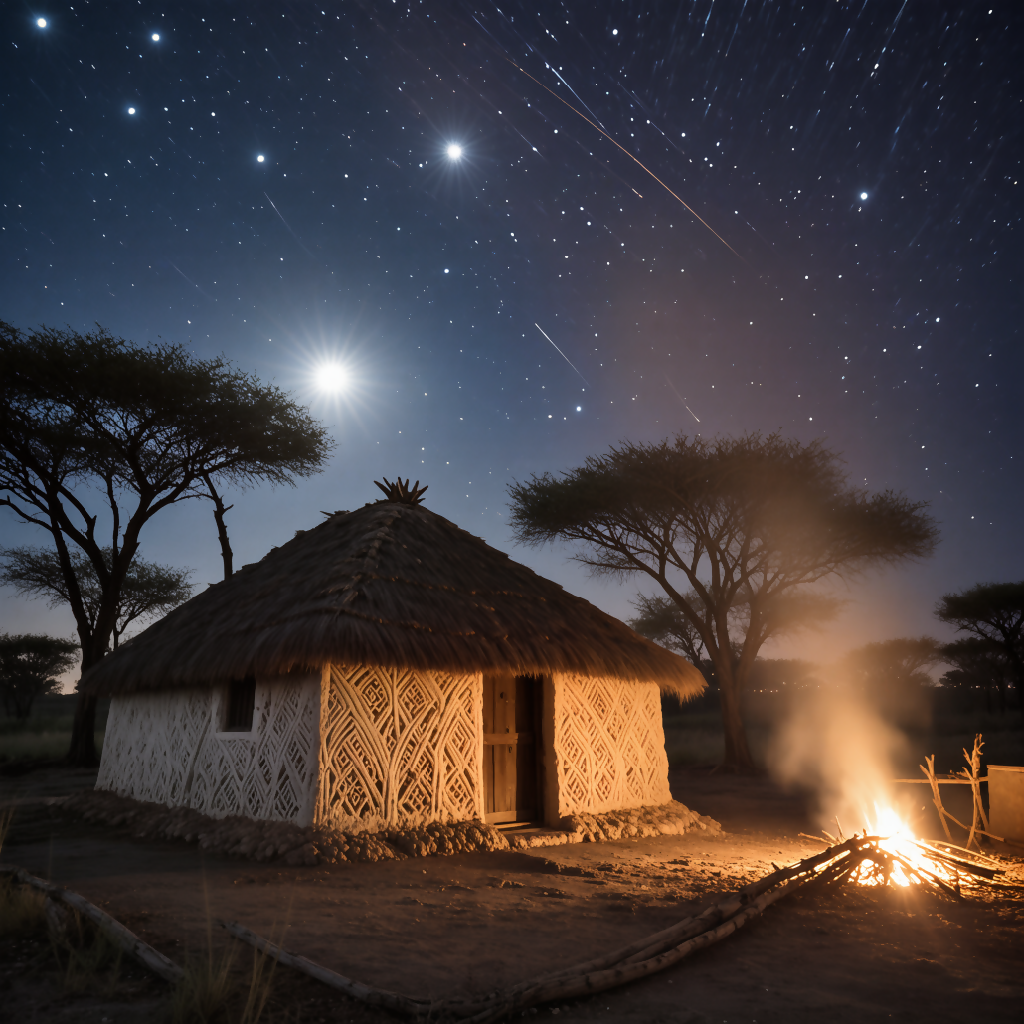 Step into serenity with this ultra-realistic 8K night scene capturing a traditional mud house under a celestial sky. Illuminated by a warm bonfire and bathed in moonlight, the image highlights intricate mud wall textures, a thatched roof, and an awe-inspiring view of stars and meteor trails. Surrounded by acacia trees and composed with cinematic depth using Canon EOS R5 clarity, this visual masterpiece blends rural charm with cosmic wonder. Ideal for wall art, digital storytelling, nature documentaries, or educational visuals.