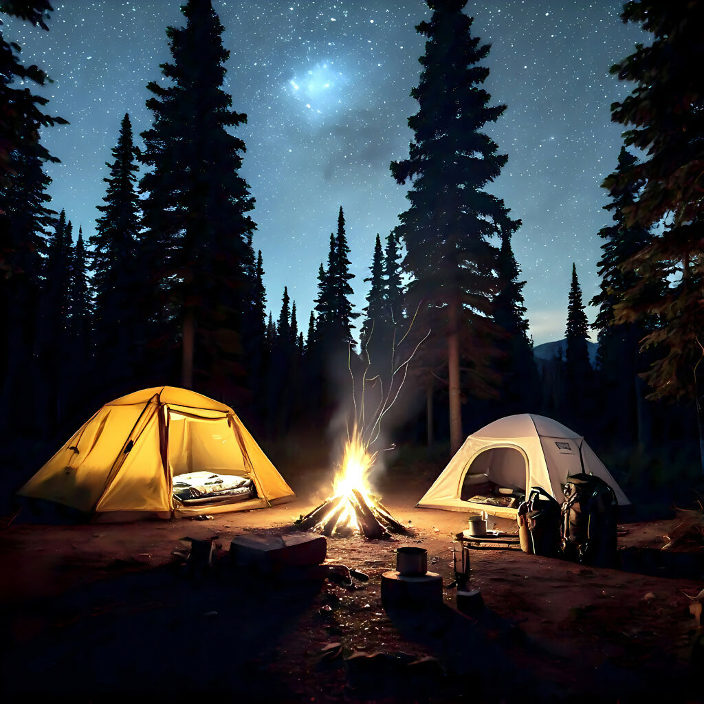 Immerse yourself in the tranquil magic of Starry Forest Campfire Escape, a landscape AI artwork that captures the soul of wilderness adventure. Two tents glow softly under a canopy of stars, nestled among towering pine trees. A warm campfire crackles at the heart of the scene, surrounded by gear that whispers stories of exploration and camaraderie. This piece evokes the timeless joy of disconnecting from the digital world and reconnecting with nature. Whether you're a dreamer, a traveler, or a stargazer, this artwork invites you to relive the serenity of a night under the cosmos.