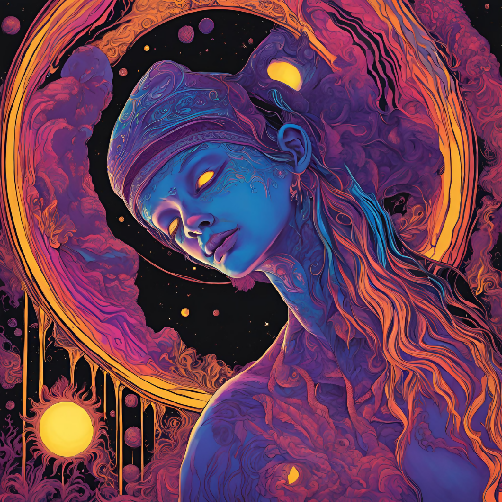 This piece is in the psychedelic and visionary art style with elements of surrealism and fantasy illustration. The intricate patterns, neon color palette, glowing eyes, and cosmic elements create a mystical and otherworldly feel.