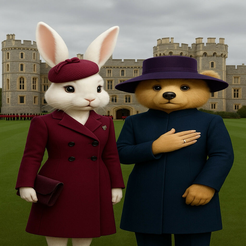 A charming, refined portrait of two anthropomorphic companions dressed in elegant state-visit attire — one in a deep maroon coat and pillbox-style hat, the other in a formal navy ensemble and wide-brim hat — posed on a palace lawn. The composition is inspired by classic royal ceremonial fashion and iconic state-visit looks, reimagined with a playful, contemporary twist.
