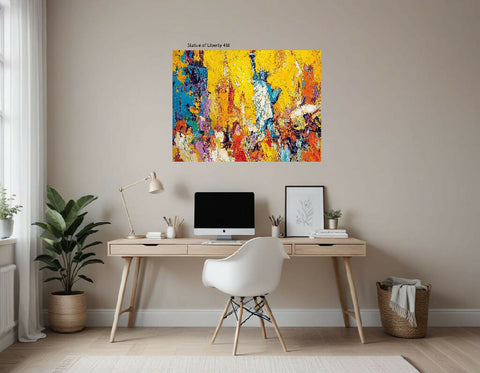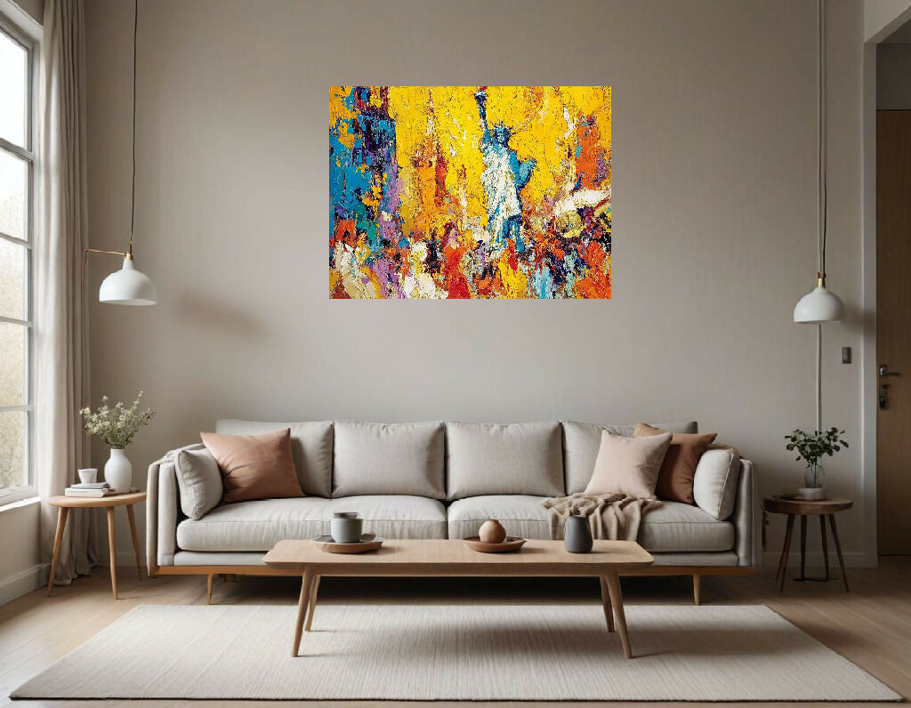 The Statue of Liberty stands prominently, rendered in shades of blue and white, her torch raised high. Behind her, a skyline emerges, depicted with expressive strokes that suggest iconic New York buildings. These structures are painted with a mix of orange, yellow, and blue hues, adding to the painting's overall sense of warmth and energy.