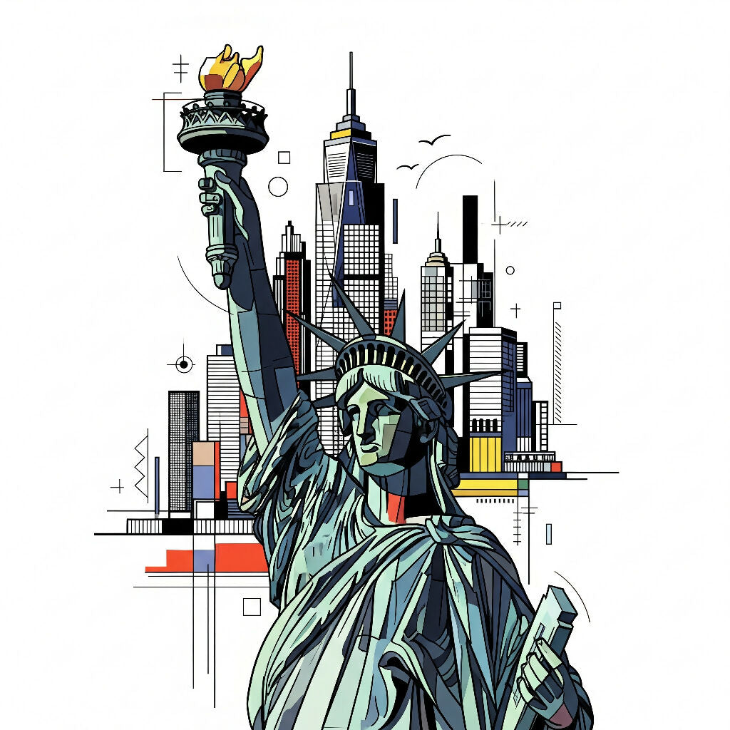 This is a stylized illustration of the Statue of Liberty, rendered with a contemporary, almost geometric aesthetic. The statue itself features prominent lines and distinct color blocking, giving it a modern, graphic feel. In the background, a cityscape with various skyscrapers is depicted, also in a simplified, angular style. Abstract lines, shapes, and small symbols are incorporated throughout the composition, adding to the modern art vibe. The overall impression is a vibrant and artistic interpretation of this iconic landmark.