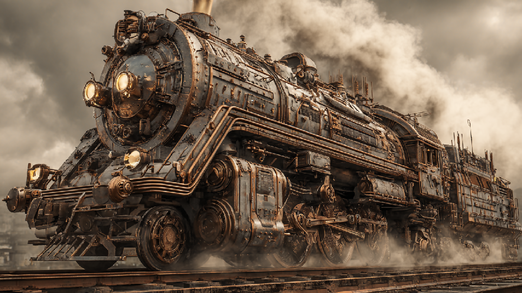 Tags: dieselpunk, steam locomotive, industrial, retrofuturism, mechanical art, gears, pipes, steam power, vintage train, AI-generated, concept art, atmospheric, historical machinery, dramatic lighting