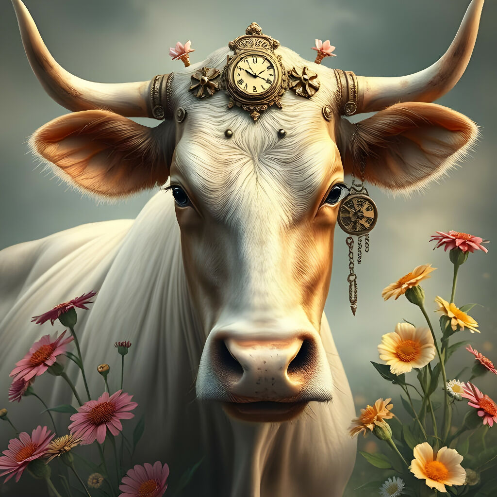 This image features a regal-looking white cow adorned with ornate, vintage clockwork jewelry. A baroque-style clock is centered on its forehead, flanked by golden decorations and small flowers. On its ear hangs a dangling timepiece pendant, adding to the surreal, almost mythological character of the scene. The cow stands amid vibrant wildflowers, including daisies and coneflowers, under a softly lit, dreamy sky. The overall mood is whimsical and fantastical, blending nature with elements of steampunk and surrealism.