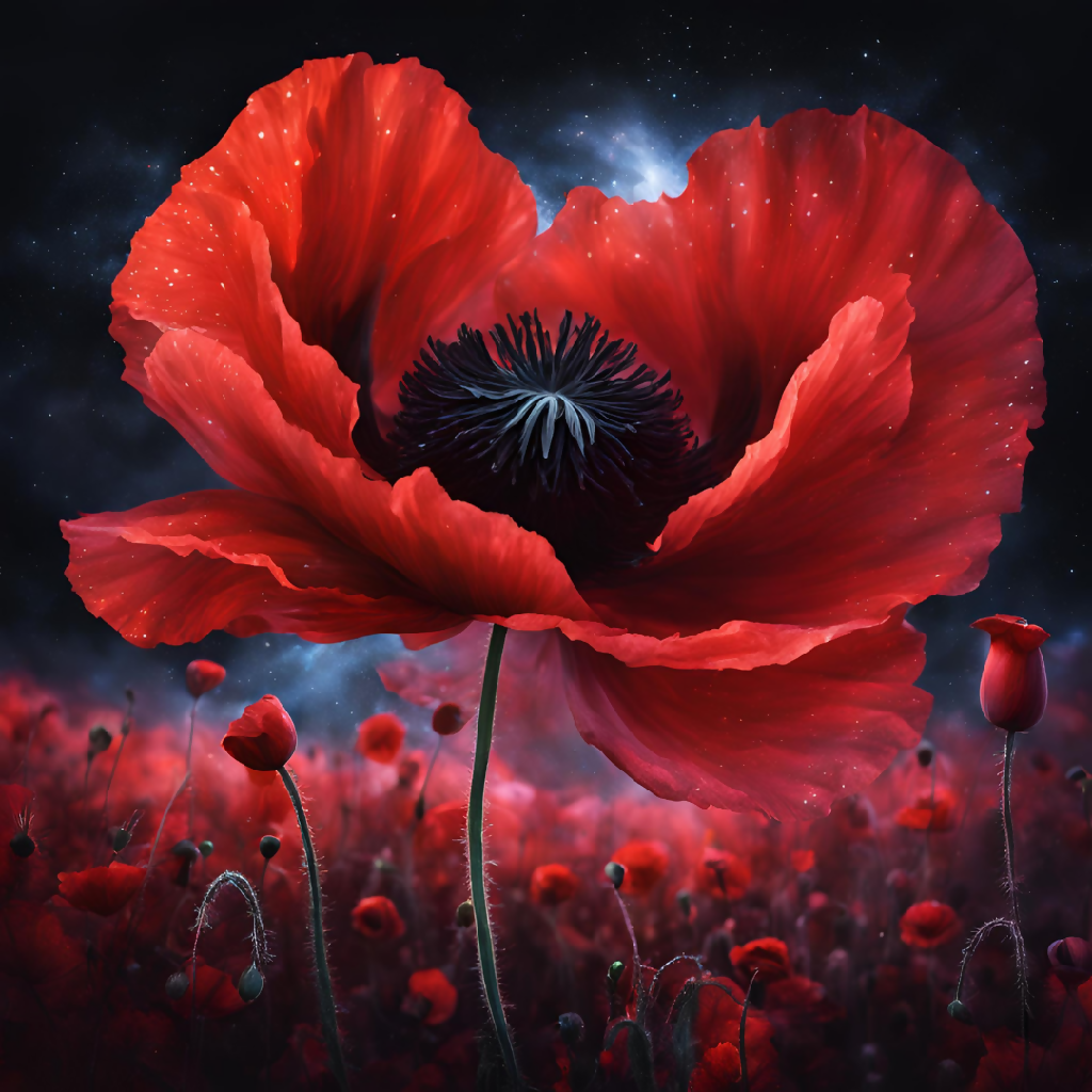 The art style in this piece blends surrealism and fantasy realism with elements of photo-realism. The intricate details of the poppy flower, combined with the cosmic background, create a dreamlike, otherworldly feel. The use of dramatic lighting, rich contrast, and vibrant red tones enhances the ethereal atmosphere, making the piece visually striking and immersive.