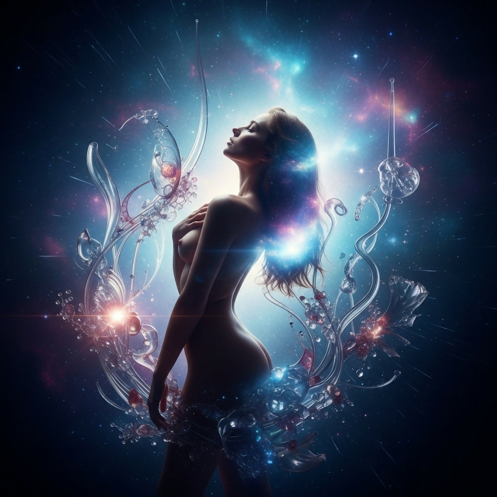 This AI-generated artwork depicts a luminous, ethereal figure in profile, embraced by intricate, glowing crystalline forms against a profound cosmic backdrop, evoking a moment of transcendent grace and universal connection.